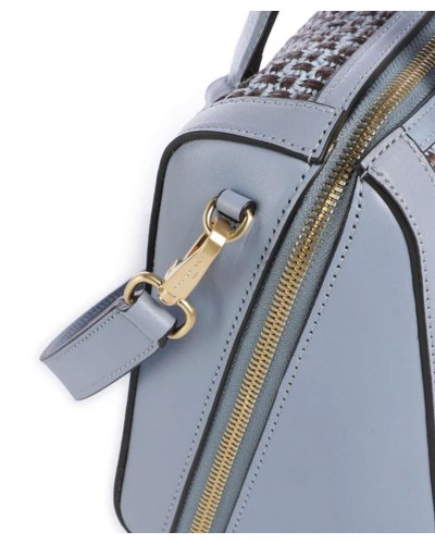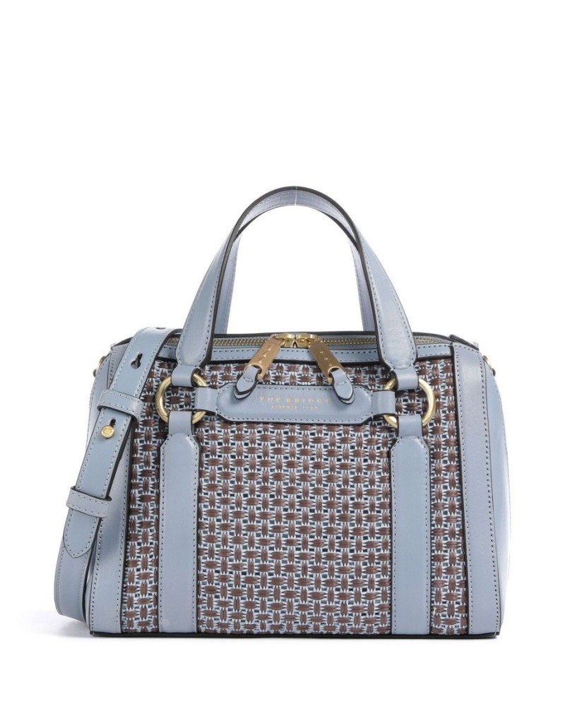 La parte frontale è impreziosita da un'esclusiva lavorazione a intreccio, dove la pelle si sposa con la trama del tessuto per un effetto visivo tridimensionale e sofisticato. I doppi manici arrotondati e la tracolla rimovibile e regolabile, entrambi realizzati in solida pelle di vacchetta, offrono diverse opzioni di porto, garantendo comfort e versatilità sia a mano che a spalla. I dettagli in metallo lucido e l'iconico logo The Bridge completano un accessorio che incarna l'essenza del Made in Italy.
