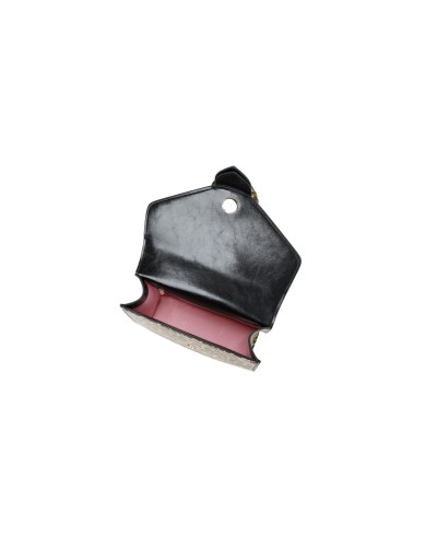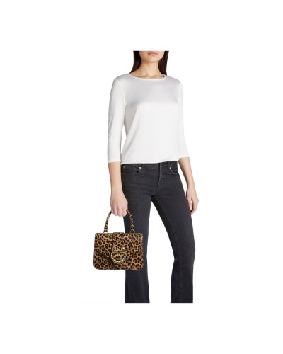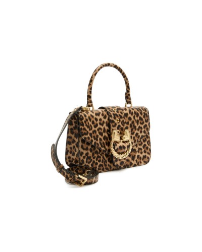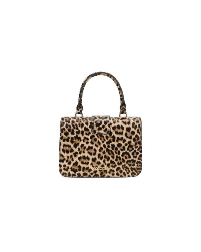 Realizzata in vera pelle di alta qualità, la borsa presenta una sofisticata stampa leopardata all-over su cui risalta l'esclusivo logo frontale. La silhouette strutturata, che richiama il fascino delle "lady bag" d'epoca, è impreziosita da un solido manico singolo e da una chiusura a scatto metallica che garantisce sicurezza e un tocco retrò. La praticità è assicurata dalla tracolla regolabile e removibile, che permette di passare agevolmente da una portabilità a mano formale a un look crossbody più moderno e dinamico.