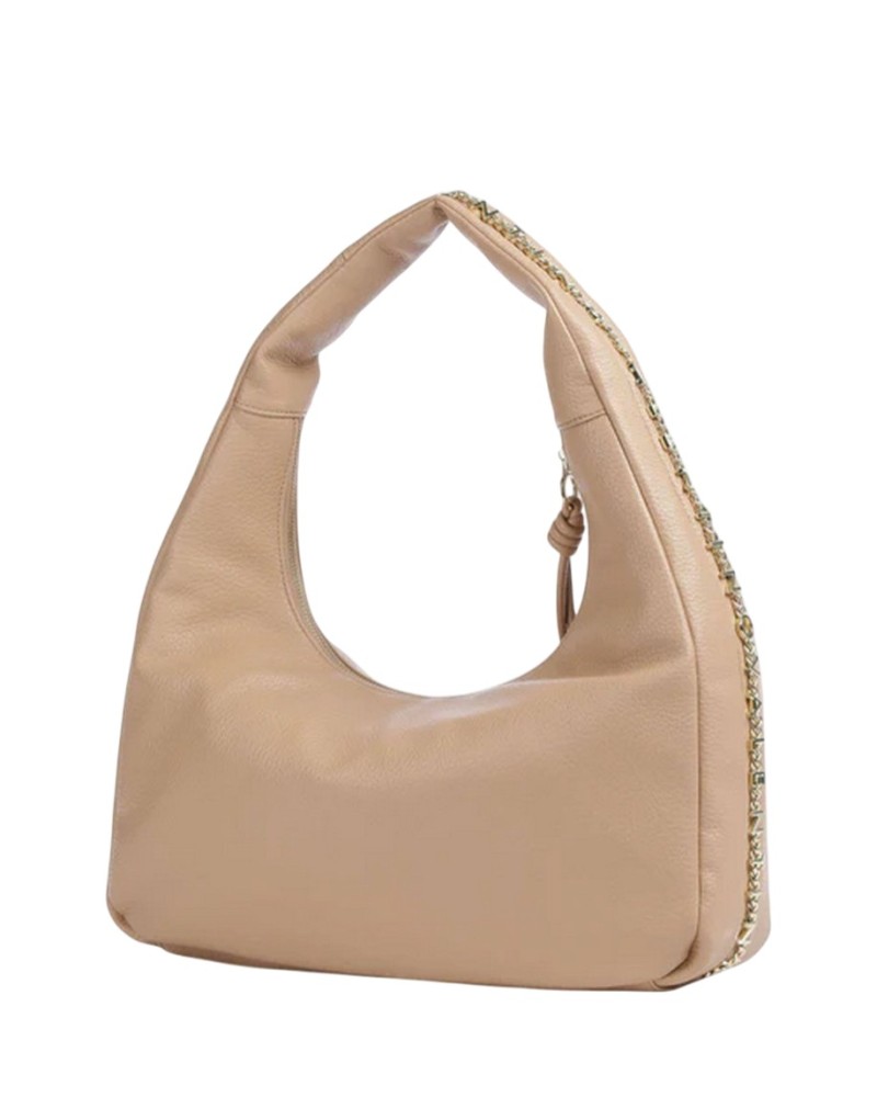 Afferma la tua eleganza con la borsa a sacca Harmonia firmata Valentino, un accessorio dal design sofisticato e ultra-contemporaneo che ridefinisce il concetto di borsa hobo. Realizzata in morbida ecopelle di alta qualità, questa borsa si distingue per la sua silhouette fluida e per l'esclusivo dettaglio a catena integrato lungo il profilo del manico, un tocco di luce che conferisce un carattere deciso e glamour a ogni tuo outfit.